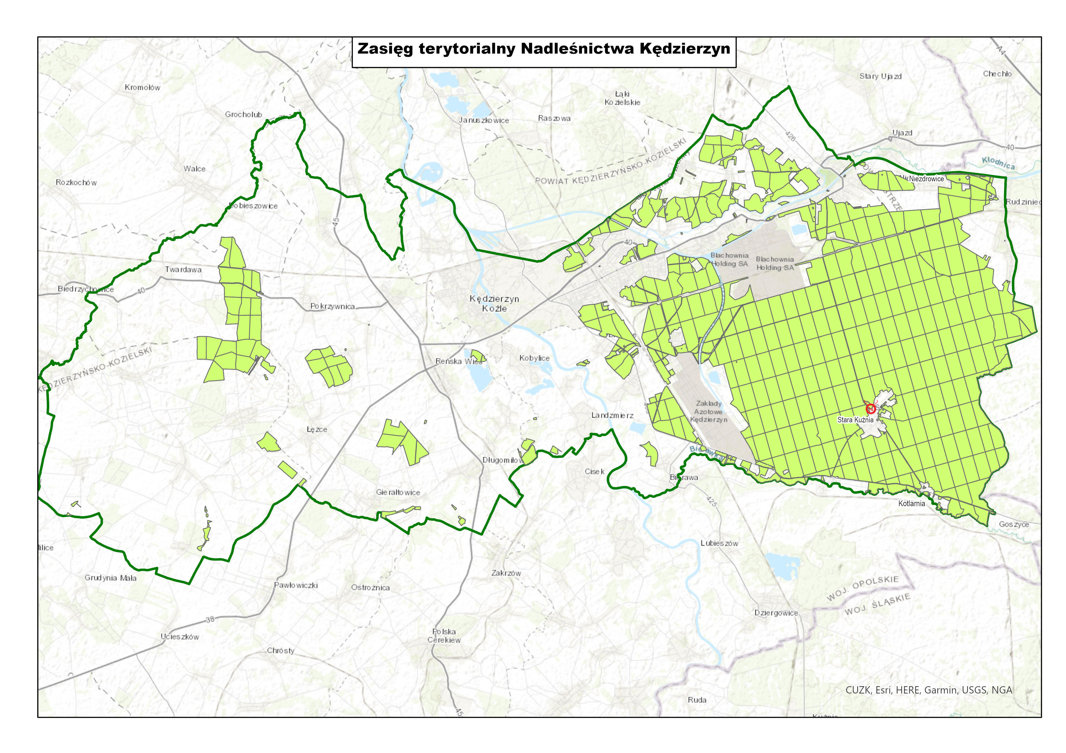 Mapa zasięgu terytorialnego Nadleśnictwa Kędzierzyn: